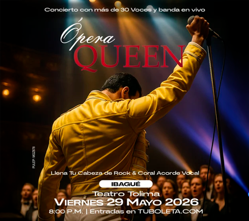El 29 de mayo en Ibagué, el espectáculo Ópera Queen presentará una poderosa fusión entre el rock de Queen y la fuerza de la música coral. El show contará con una coral de 30 voces que acompañará a la banda en vivo, creando una experiencia sonora épica para clásicos como Bohemian Rhapsody, Somebody to Love y We Are the Champions.Una puesta en escena que combina rock, lírica y emoción para revivir el legado de Queen en un formato monumental pensado para públicos de todas las edades. -